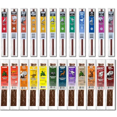 - DELICIOUS VARIETY: The Buffalo Bob's Wild Game Meat Snacks (24 pack) offers an assorted beef jerky variety pack featuring a mix of flavorful strips and sticks, perfect for any jerky lover.
