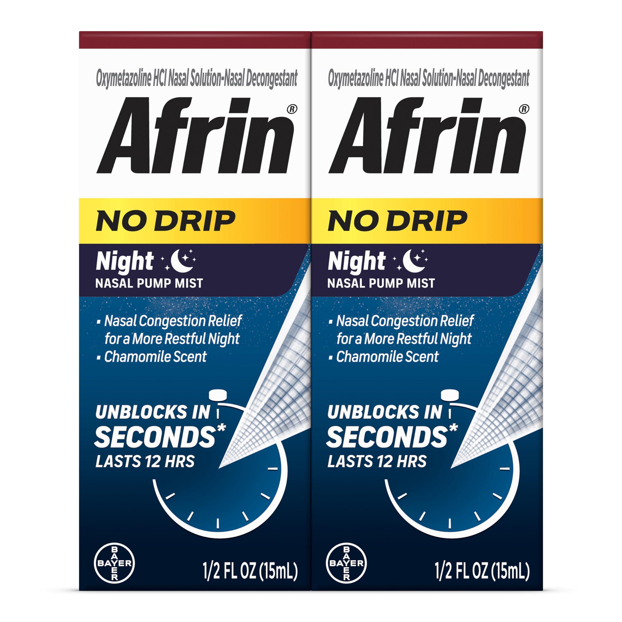 - Ridiculously Fast Relief: Unblock your nose in seconds with Afrin No Drip Night Nasal Mist, a fast-acting nasal pump mist decongestant providing non-drowsy, 12-hour nasal congestion relief in a convenient twin pack