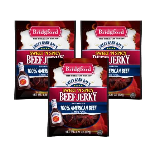 Bridgford Sweet Baby Rays Beef Jerky Sweet N Spicy 3.25 oz Pack of 3 - High Protein Sweet and Spicy Beef Jerky for Your Dietary Preference - Ready-to-Eat Spicy Beef Jerky for On-the-Go Snacking