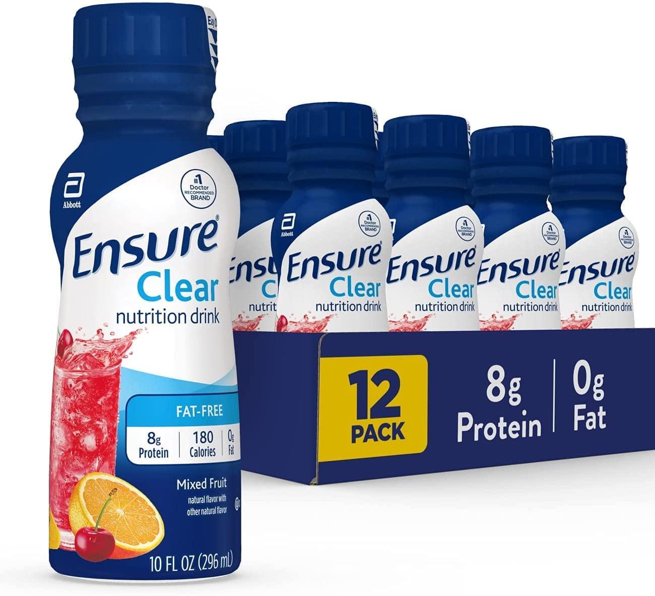 From Ensure, the #1 doctor-recommended brand*, comes a refreshingly different way to get the nutrition you need. Ensure Clear delivers complete, balanced nutrition in a light, fat-free, Mixed Fruit flavor that's easy to drink. Each bottle provides 8 grams of high-quality protein to support muscle health and energy, along with 15 essential vitamins and minerals to help fill nutritional gaps. With 180 calories and zero grams of fat, it's a guilt-free way to fuel your active lifestyle. Ensure Clear is also gluten-free, suitable for lactose intolerance, halal, and kosher. *Among doctors who recommend liquid nutritional products to their patients. Not for people with galactosemia.