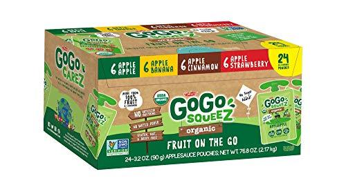 - VARIETY PACK OF BULK SNACKS: Stock up with this pack of 24, 3.2 ounce GoGo squeeZ Organic Fruit on the Go, (6) Apple Apple, (6) Apple Banana, (6) Apple Cinnamon and (6) Apple Strawberry unsweetened applesauce pouches is kitchen pantry safe (no refrigeration required)
