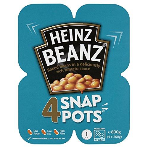 MICROWAVEABLE PORTIONS. Snap Heat & Eat. Heinz Beanz? Snap Pots: Just the right amount for beans on toast, but without the mess and hassle. Baked beans in a deliciously rich tomato sauce. DIETARY INFORMATION. 1 of your 5 a day when eaten as part of a balanced diet. No artificial colours, flavours or preservatives. Gluten free. Suitable for vegetarians. Made in the EU. Ingredients Beans (51%), Tomatoes (33%), Water, Sugar, Modified Cornflour, Salt, Cornflour, Antioxidant - Ascorbic Acid, Spice Extracts, Herb Extract