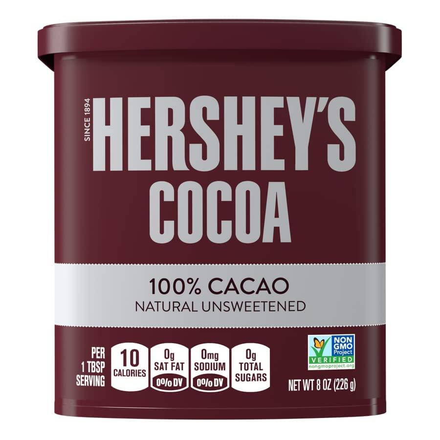 - Comes in re-sealable cans to help keep cocoa fresh Includes 2 containers of Hershey's Cocoa, Unsweetened (8-Ounce Container).