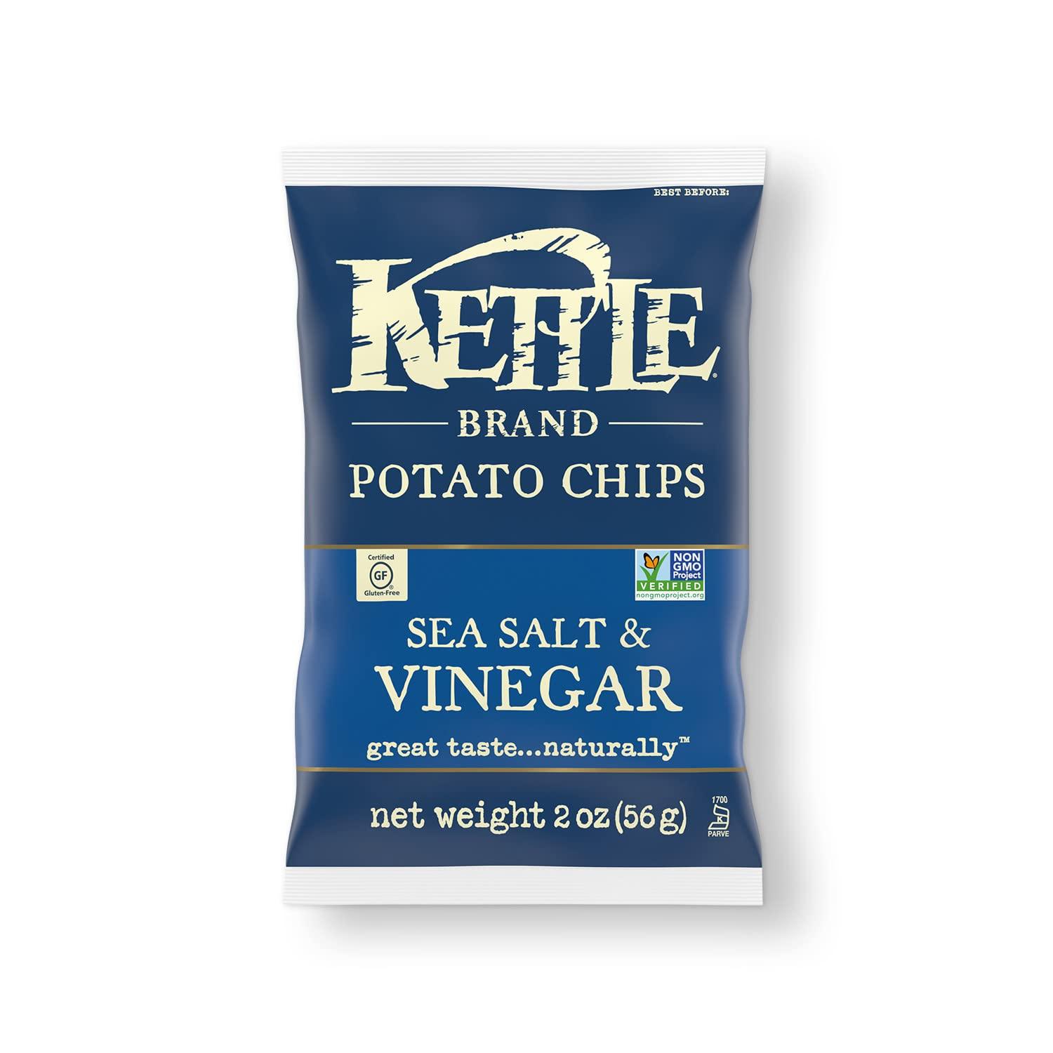 Kettle Brand Salt & Vinegar kettle cooked chips start with a search for undisputed potato excellence. Determined not to disrupt the flawless, spudsy goodness, these beauties are kettle cooked, skins on, one small batch at a time. Delight your taste buds with our take on this flavorful favorite with a balance of sea salt with a hint of tongue-puckering vinegar. And of course, these chips come complete with the satisfying crunch you love. When you open a bag of our Kettle Brand potato chips, you know you're getting incredible kettle chips made with authentic recipes by real people. From their farms to our kitchens and then to your home, the time and attention every Kettle Brand worker puts into their products is care you can trust. All that, plus Kettle Brand chips deliver a delicious snack thats non-GMO Project Verified, and Certified Gluten-Free. These 2-ounce snack bags of kettle chips are great at home or on-the-go. Kettle Brand potato chips. Extra in a good way.