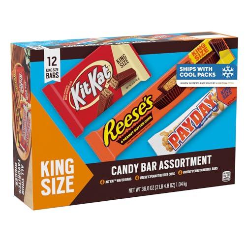 Enjoy a delicious chocolatey or peanutty treat anywhere and anytime with KIT KAT, PAYDAY and REESE'S assorted king size candy bars. Offering three crowd-pleasing favorites, this king size assortment is perfect for sharing with family, friends, teammates or co-workers. Stock up on all of your favorites with this convenient variety box. Bring it into the office break room, to your next sports game or tailgate or simply store it in your home pantry for a sweet treat any time. This assorted box of candy bars contains 4 KIT KAT milk chocolate wafer bars, 4 REESE'S milk chocolate peanut butter cups candy and 4 PAYDAY peanut caramel candy bars all in king size bars ready to take on the go or enjoy at home.