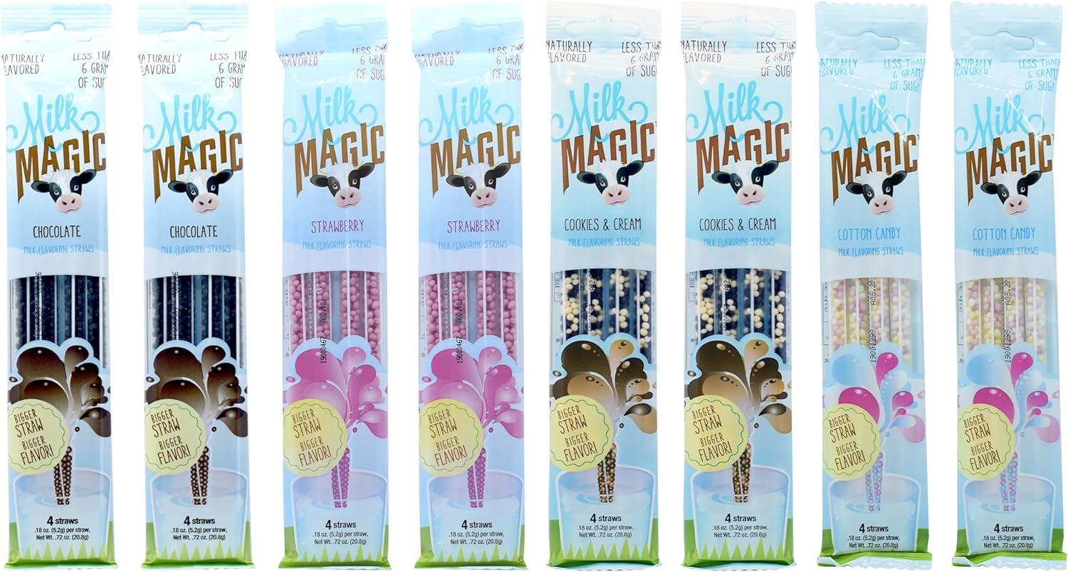 - INCLUDES 32 MILK STRAWS IN 4 FLAVORS - Includes 8 Cookies and Cream straws, 8 Chocolate straws, 8 Strawberry straws, and 8 Cotton Candy Flavor Milk Straws. Milk Magic straws are also availble in many other flavors. Please Note: Date printed on packaging is a manufacturing date, NOT an experation date.