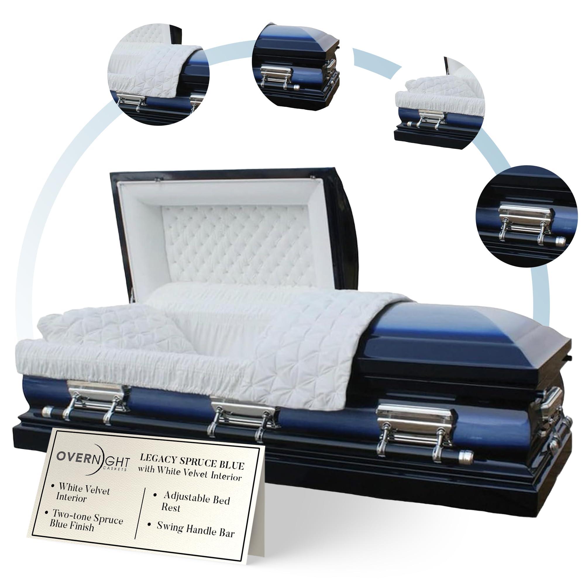 - [INTERIOR & EXTERIOR] This casket features an automotive-quality two-toned spruce blue exterior finish. The interior is lined with white velvet in an elegant French Fold design, complete with a matching pillow/throw and detailed tufting on the head panel. It also includes an adjustable eternal rest bed for turnkey viewings. With its stately design, the Legacy honors a life of achievement and success.