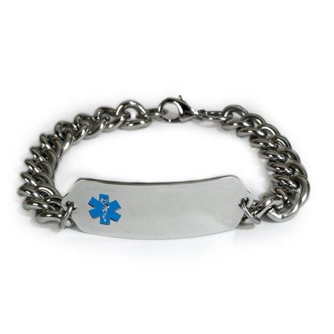Back side of the bracelet plate features engraving: SEE WALLET CARD. - The Medical Id Plate 1-5/8" x 7/8" is made from non-allergic, rust free stainless steel, polished to a mirror finish and curved for wrist wear.