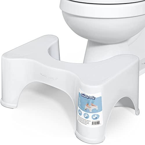 Original 9" Stool Dimensions: 13.25"D 21"W 9.63"H. Sizing Tips: How to Pick Your Squatty Potty. (1) By Toilet Type: The 9" Squatty Potty Original Toilet Stool is designed for a comfort toilet (16.518" from floor to the top of the bowl). If you have a 1416" standard toilet (measured from the floor to the top of the toilet bowl), then you may want the 9" stool instead. (2) For Advanced Squatters: You may prefer the 9" stool, which raises your feet 9" off the floor. People who are limber and comfortable in a full squat, or have shorter legs, will find the 9" stool easy to use. (3) For Large Households: The 7" Original Toilet Stool is sized for most squatters. If you have people of varied heights using the same bathroom, you might consider the Adjustable 2.0 Stool, which features a 7" stool with a riser you can add to make it a 9" stool. We also offer kid-sized stools called Potty Pets.
