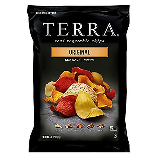 Open up a bag of Terra Original Chips with Sea Salt for a unique and sophisticated snacking experience. This chip blend features yuca, sweet potato, parsnip, taro root, batata and beet-dipped vegetables dusted with sea salt to enhance the flavors of the vegetables. As colorful as they are delicious, our chips are made with real, non-GMO vegetables for a snack that's vegan and gluten-free. You can snack without guilt because our chips contain 0mg of cholesterol and 0g of trans fat and no artificial flavors or artificial preservatives. We are proud to partner with the Seed Savers Exchange to help save heirloom seeds and promote greater vegetable diversity. Includes twelve 6.8 oz bags of Terra Original Chips with Sea Salt. For over two decades, Terra Chips has had a passion for creating delicious, high-quality chips. From the moment you open the distinctive shiny black bag, youll understand the Terra brand difference. Every bag of our real vegetable chips is a feast for your eyes and a delight for your taste buds, offering a sophisticated snacking experience unlike any other.