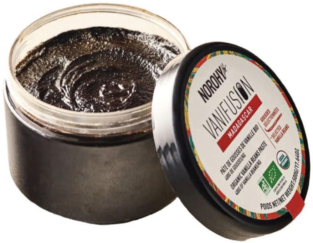 Valrhona Norohy Vanifusion Organic Vanilla Bean Paste 500 grams of paste, 400 of them from Madagascar vanilla beans For use not only in pastry, chocolate, ice cream and all other types of sweet confectioneries, but also in all savory dishes Produced via infusion, extracting key active plant flavors by dissolving them in a liquid Endowed with the aromatic profile sought after by top chefs, with a high natural-vanillin content and intense woody and floral aromas One organic ingredient after another: cane sugar syrup, vanilla concentrate, vanilla-bean powder, exhausted vanilla seeds and cane sugar all of them products of organic farming In just one step, the delicateness and intensity of bourbon vanilla from Madagascar along with the aromatic complexity of all the parts of a vanilla bean are added to your creations Every 5 grams of Vanifusion paste = 3 grams of beans Gluten free, and containing no additives or flavor enhancers Clean and easy to measure Made in FranceMade in a facility that uses milk. May contain nuts, soya.